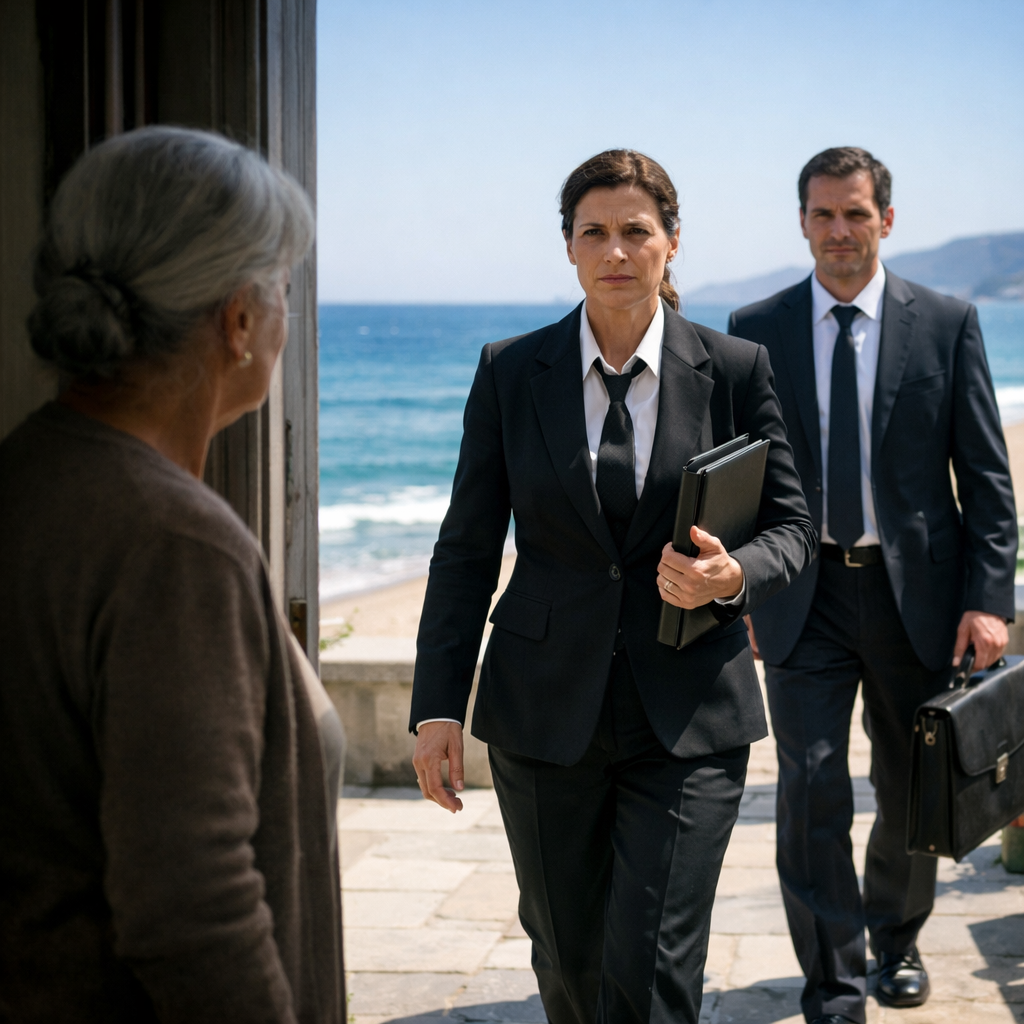 Наступного дня дув морський вітер, і на веранді смикав маленький синьо-жовтий прапорець. Рівно через дві години після обіцяного у двір заїхав чорний позашляховик. Ольга вийшла першою — і її погляд одразу побіг по вікнах, по краєвиду, по деталях, ніби вона оцінювала товар. Ігор ішов за нею з натягнутою усмішкою. Третім був чоловік у сірому костюмі з портфелем. Вони постукали різко, без тепла. Коли я відчинила, Ольга не обійняла мене — вона навіть майже не глянула в очі. Її цікавив не мій стан, не моє життя, а простір за моєю спиною.