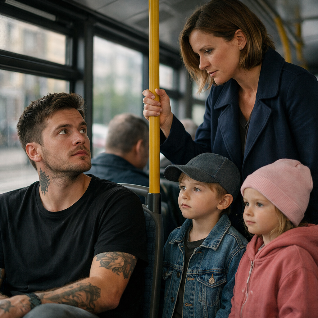 На одной из остановок, когда двери распахнулись и в салон ворвался холод, вошла женщина с двумя маленькими детьми. Один ребёнок крепко держал её за руку, второй прижимался к боку и цеплялся за куртку, словно боялся потеряться в людской толпе. Женщина была раздражённой уже с порога — видно было по тому, как она оглядывала салон, будто выбирала, на кого сорвать усталость. Свободных мест не было совсем.Её взгляд почти мгновенно остановился на парне с татуировками. Возможно, потому что он выглядел моложе других сидящих. Возможно, потому что внешность казалась ей удобной мишенью. Она подошла к нему вплотную, нависла над сиденьем и сказала громко — так, чтобы слышали все: — Молодой человек, уступите место. У меня двое детей.