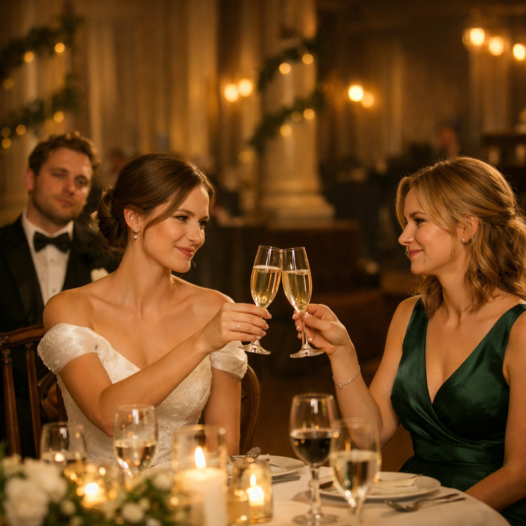 — А теперь слово главной подружке невесты! — объявил ведущий.Соня встала. На мгновение ладонь легла на край стола, как будто ей нужно было убедиться, что пол под ногами не двигается. Она улыбнулась — широко, ярко — и пошла к сцене. Конечно, она выбрала место рядом с тортом. Ей нужен был фон для фотографий: золото на мастике, сахарные цветы, роскошь, которая говорила за неё.