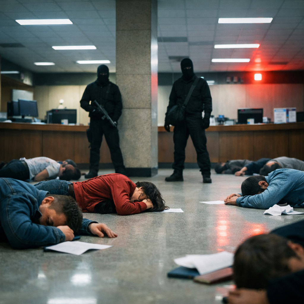 Потім блиснув ніж. Не просто як предмет — як знак, що тут тепер інші правила. — Лежати! Усім лежати! — крик відбився від стін і дзеркальних перегородок, різкий і нервовий. Один грабіжник ходив між тілами, і його чоботи гупали, мов відлік до чогось невідворотного. На ньому була чорна балаклава, дихання запітнювало тканину. У руці тремтів довгий ніж — і він переконував себе, що це не страх, а адреналін, що тремтить не він, а весь світ навколо. Другий стояв біля дверей сховища, стежив за залою, очі металися за маскою. План був простий: зайти, змусити всіх лягти, зняти касети, відкрити те, що вдасться, і зникнути до того, як хтось зреагує. Але в житті нічого не лишається простим, коли в приміщенні повно людей, а в голові — порожньо від паніки.