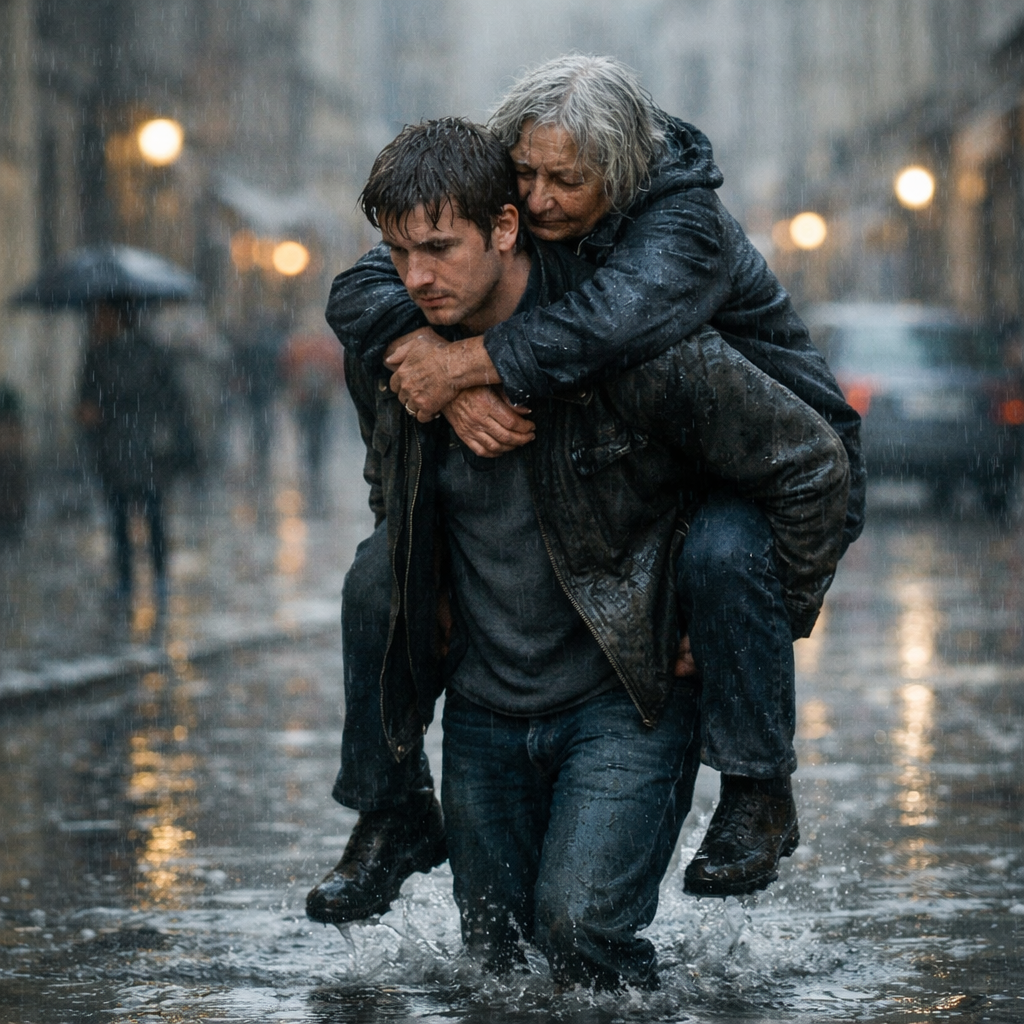 Дождь в этот момент будто усилился назло. Вода хлестала по затылку, по плечам, по рукавам, асфальт под ногами стал скользким, и каждый шаг требовал внимания, чтобы не рухнуть вместе с ней. Старушка цеплялась за мою мокрую рубашку, глаза у неё были закрыты от усталости, но пальцы не отпускали — как будто держалась за последнюю ниточку.